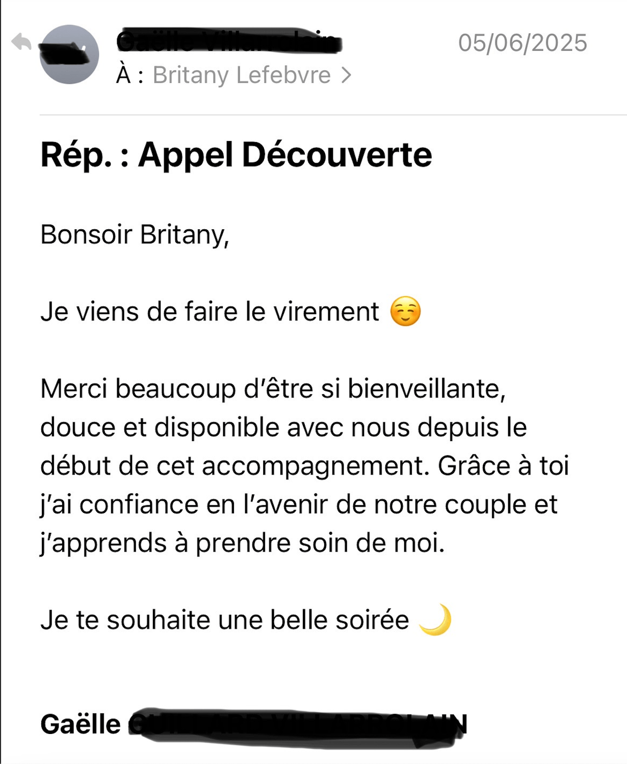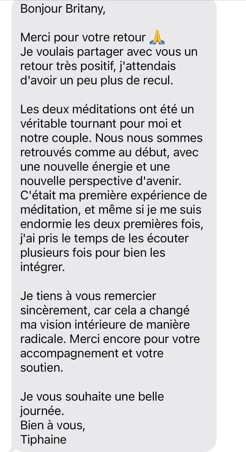 Cela fait plus d’un an que j’ai la chance d’être suivie par Britany et je ne peux que constater l’évolution positive que cela a apporté dans ma vie en général et plus précisément dans mes relations aux autres. Pleine de douceur, d’écoute et de bienveillance, je me suis toujours sentie dans un espace de confiance durant nos séances. Elle a été à l’origine de nombreux déclics dans mon esprit, qui m’ont permis de retrouver plus de paix, de confiance et d’estime de moi-même. Je ne peux que l’a remercier pour tout ça 🥰. Le petit + : ses petites pointes d’humour qui me font toujours rire 🤭